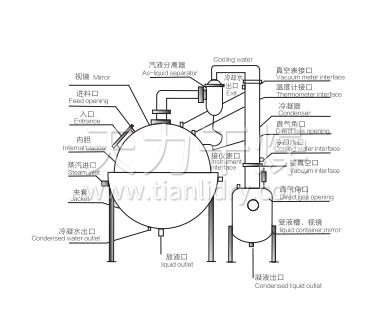 本設備主要由濃縮罐、冷凝器、氣液分離器、冷卻器、受液桶五個部分組成。濃縮罐為夾套結構,冷凝器為列管式、冷卻器為盤管式。適用于制藥、食品、化工等行業部門對液料的濃縮。并且也能回收酒精和簡單的回流提取。